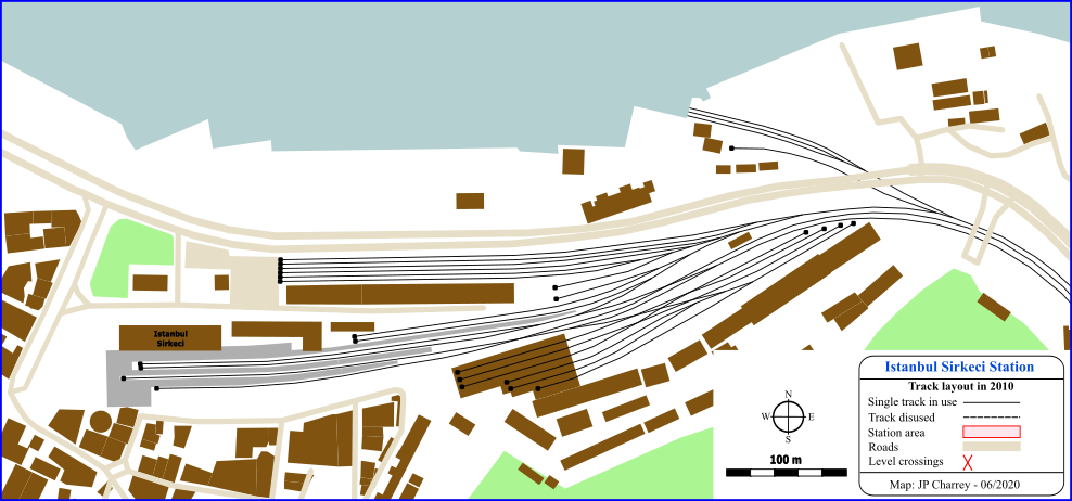The tracks and the building are located on a narrow strip of land between the sea and the Topkapi Palace. This land is in East - West alignment, but the train are exiting on the East side. Then a series of curves around the city and following the sea will allow the train to make a U turn and take their course toward the West.